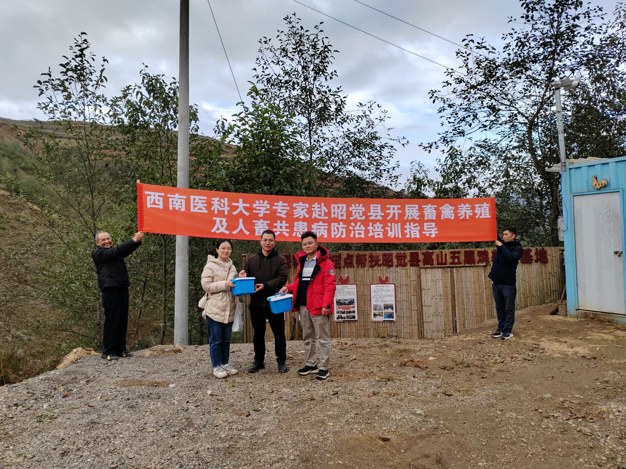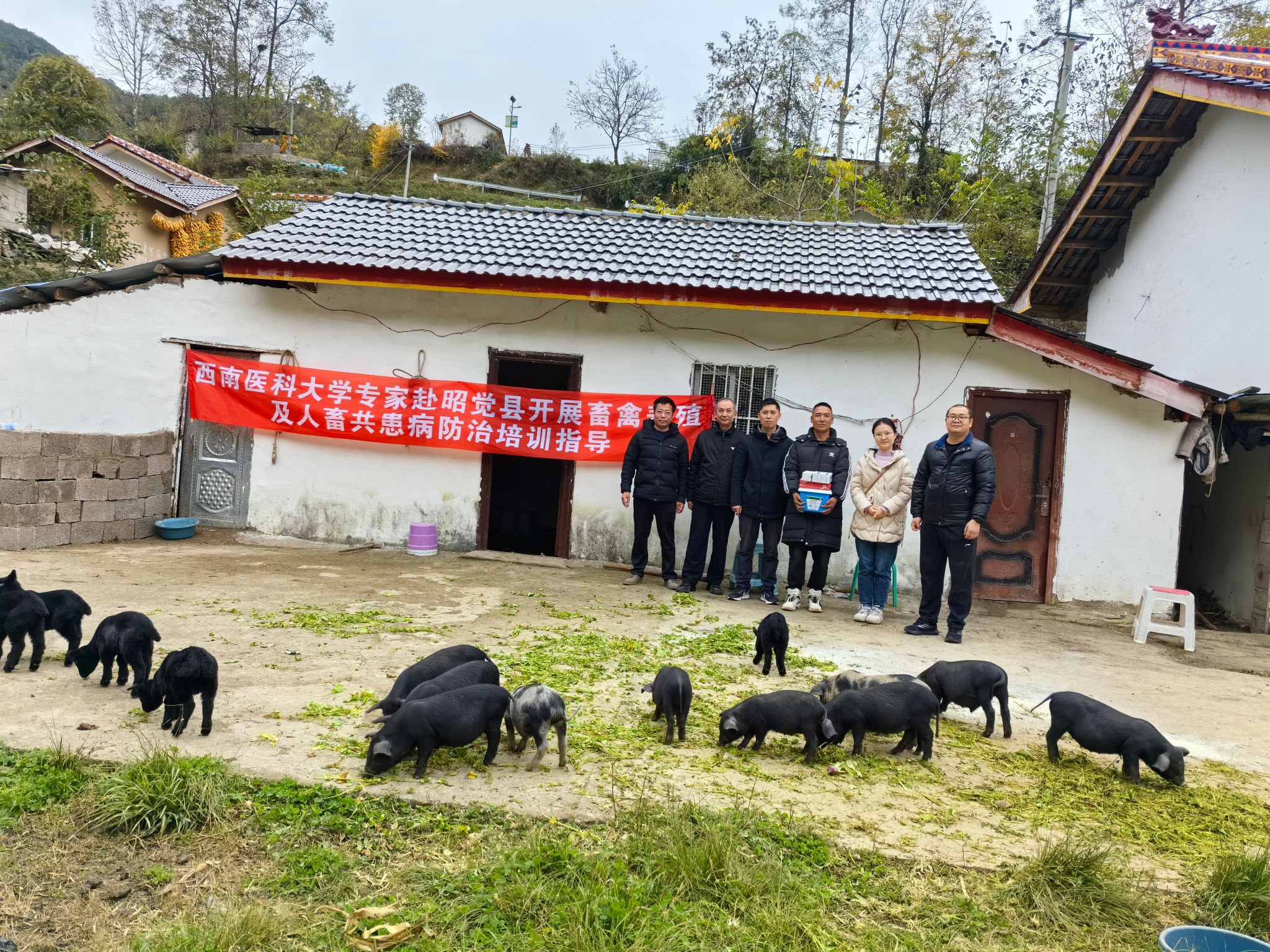 此次帮扶聚焦当地特色产业需求,针对高山绵羊、乌金猪、五黑鸡等主导畜禽品种,重点解决绿色健康养殖技术瓶颈和人畜共患病防治难题。在安曲乐村实地查看圈舍环境、养殖设施和畜禽生长状况,手把手指导养殖户优化饲养流程、规范防疫操作。针对养殖户反映的畜禽腹泻、呼吸道感染等问题,专家们现场诊断病因,开具“定制化”防治方案,并免费发放防疫药品,让养殖户“拿着问题来,带着答案走”。在汝地甲古村五黑鸡养殖基地,专家们仔细检查鸡群健康状况,查看养殖设施,针对基地疫病防控存在的问题提出具体整改建议。此次活动既送去了实用的养殖技术和防疫药品,又精准对接了养殖户的急难愁盼问题,有效提升了当地畜禽养殖从业者的技术水平和防疫意识,以科技赋能特色产业发展,为巩固拓展脱贫攻坚成果、推进乡村全面振兴贡献高校力量。