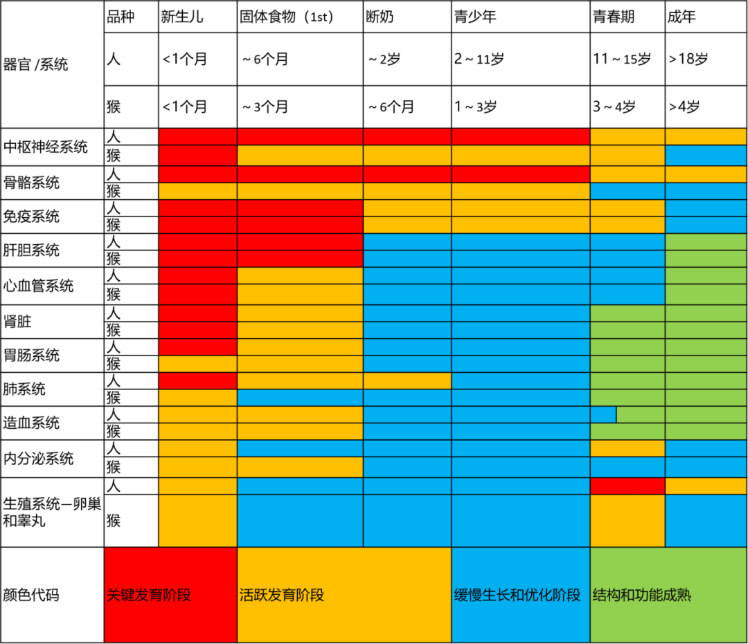 作为目前“出镜率”最高的非人灵长类实验动物,食蟹猴因与人类在解剖、生理、免疫与代谢上的高度相似性,以及靶点亲和力与药代动力学的可比性,并且较恒河猴具全年可繁育、供给更稳定的优势,已成为非临床安全性评估与基因编辑疾病模型中应用最广的物种。其在生物制品药效、药代和毒理,以及特殊给药途径评估方面具有不可替代的价值。然而,食蟹猴各个器官的成熟并不同步:有的在早期就接近成人水平,有的需要到青少年期才稳定。因此,开展研究时必须将食蟹猴各器官系统的发育年龄与人类年龄精准对齐,以更准确地判断药效与毒性,避免把正常发育变化误判为药物影响。本文参考《Journal of Medical Primatology》2022年发表的一篇综述文章,分别汇总了食蟹猴与人类对应年龄数据(见表1)及年龄相关的器官发育时序(见表2)供大家参考。基于该综述与既有研究,以下对关键年龄节点作文字化说明,便于选择合适年龄的食蟹猴开展研究和评估。