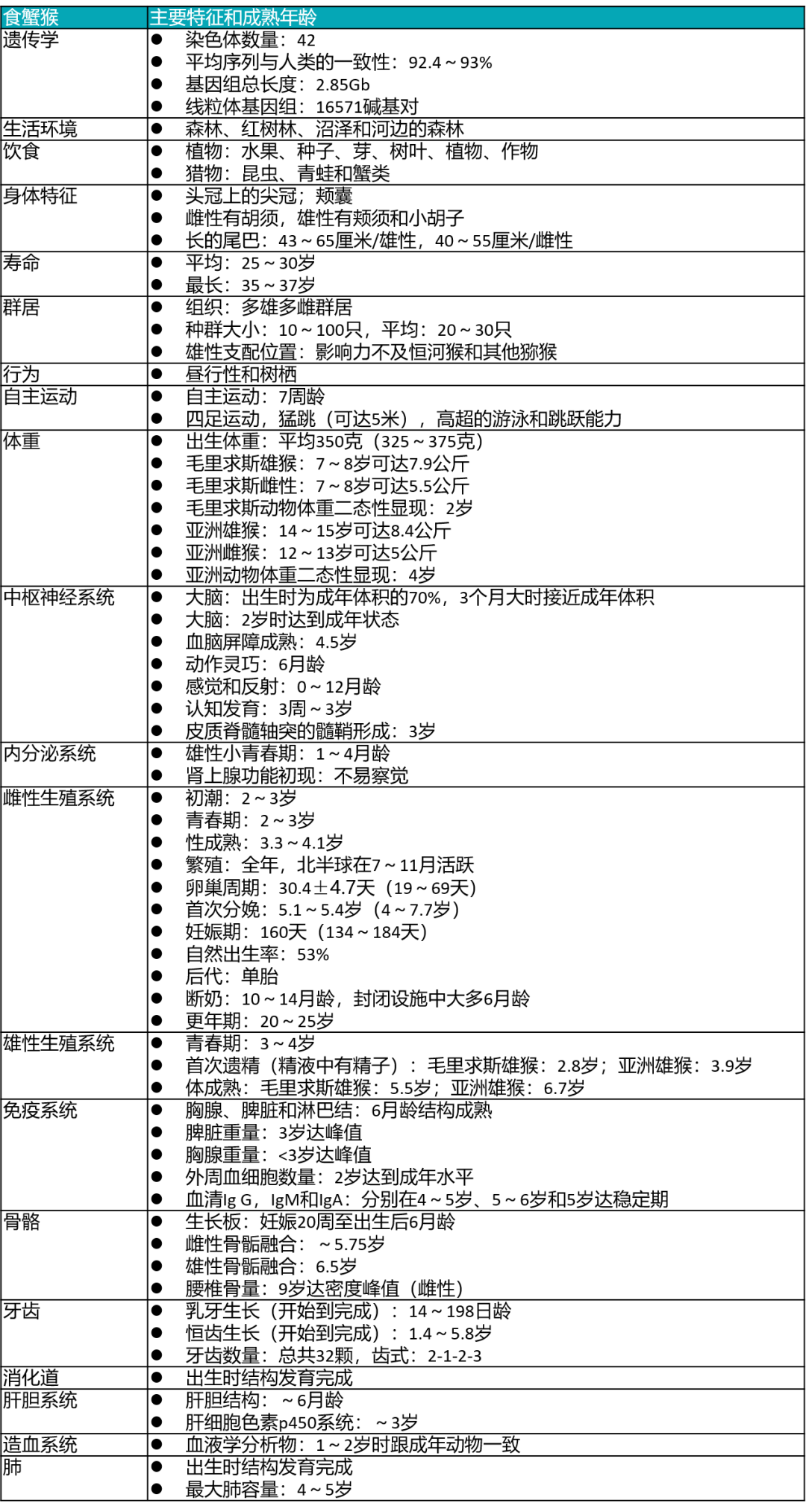 表2:食蟹猴的主要生物学特征和器官系统发育